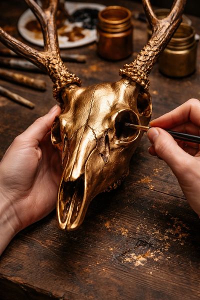 Bone & Shadow is a body of sculptural works created from genuine animal skulls, finished by hand using layered metallic pigments. Each piece is one-of-a-kind, intended for collectors and curated interiors. The collection prioritizes surface, form, and quiet presence over narrative.